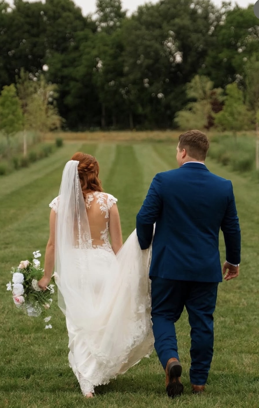 Lexi turned heads in a fitted column gown that blended elegance with a little something unexpected. Lace cap sleeves framed her shoulders, while delicate cutouts at the waist added modern flair. The illusion back and floral-trimmed train brought the romance full circle. Her bouquet featured a soft mix of white and blush roses with wisps of greenery, complementing the dramatic veil edged in crystals and lace.