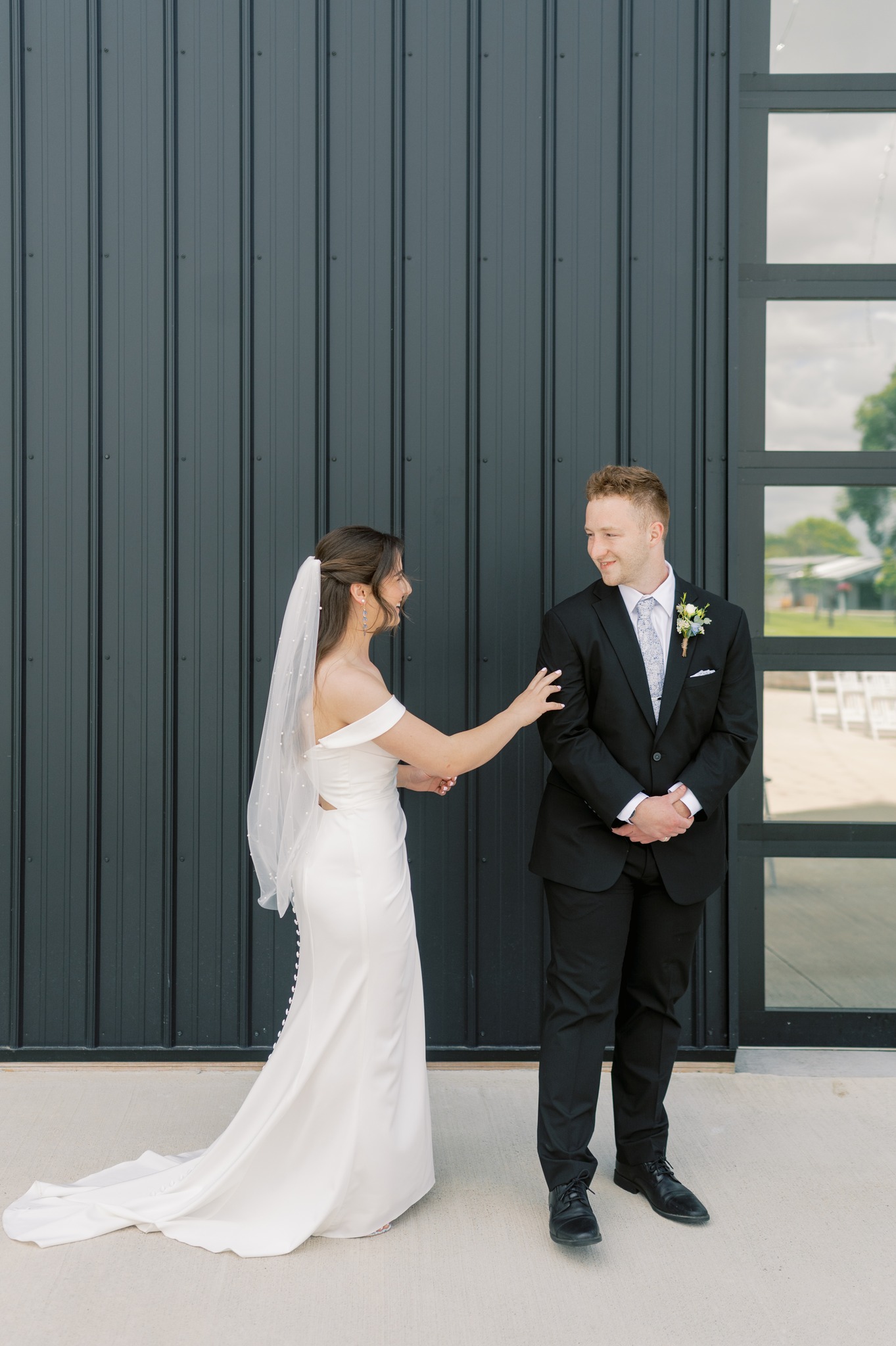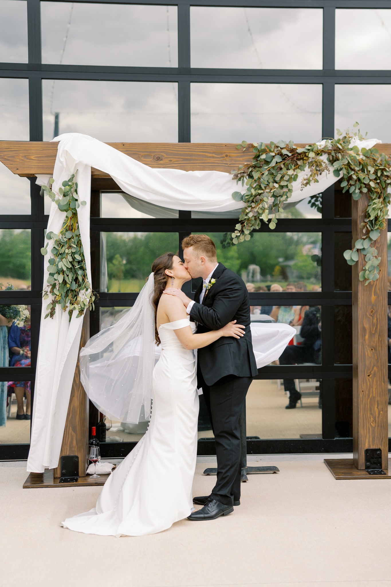 The couple exchanged vows on the venue’s patio, framed by large glass barn doors and a wooden arbor draped in soft white fabric and eucalyptus. Josie walked down the aisle in a timeless fit and flare wedding gown with off-the-shoulder sleeves and delicate buttons trailing down the back. A waist-length veil and crystal earrings completed her bridal look, while Colby wore a classic black suit and a floral dusty blue tie to match the mood.
