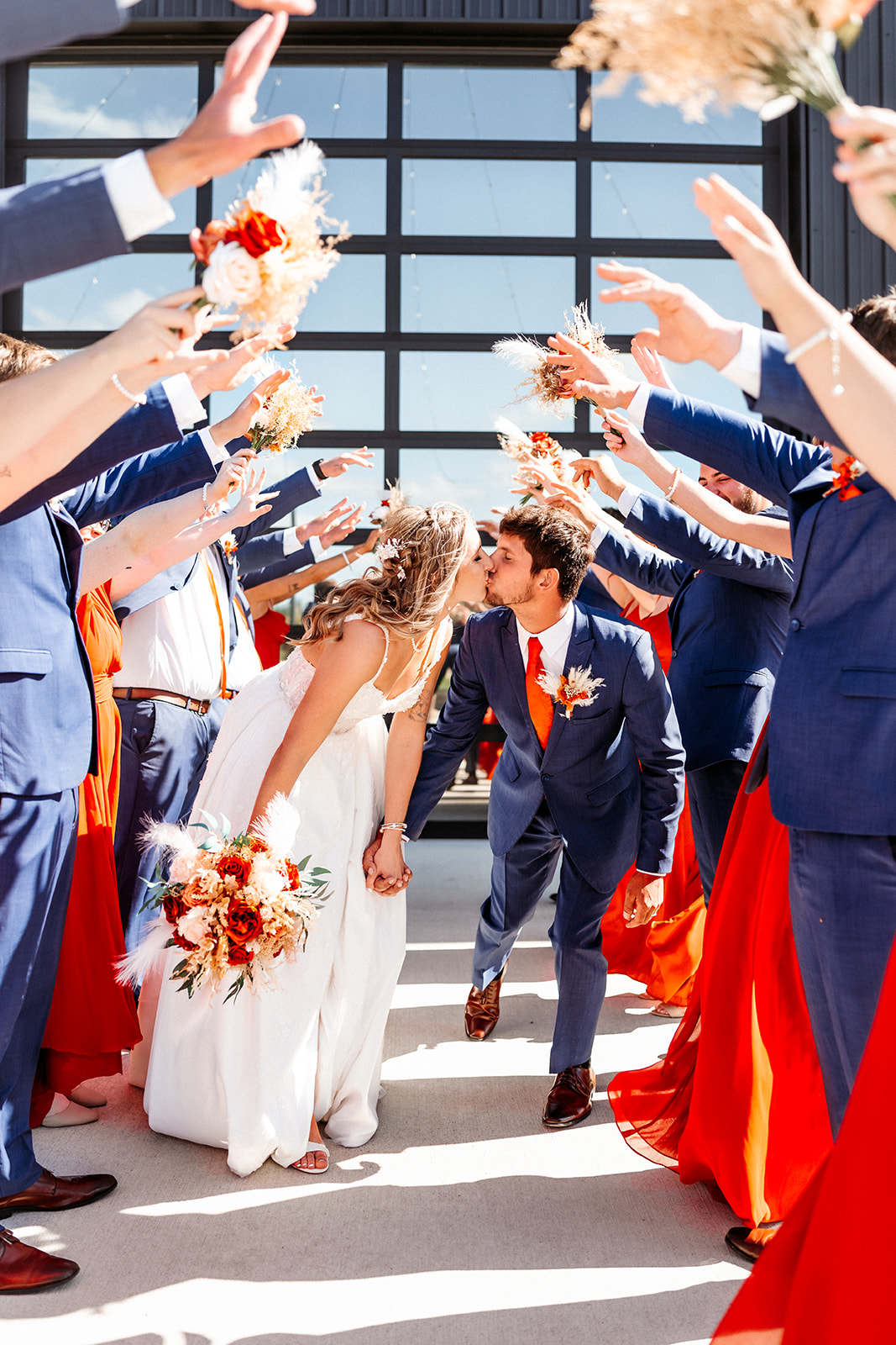 The ceremony took place on the North Patio facing the pond, where the late summer greens were just beginning to shift into early autumn tones. A wooden triangle arch anchored the space, adorned with asymmetrical florals in rich orange and neutral hues, accented by dried pampas and airy plumage. A soft beige aisle runner led the way toward the altar, while the white aisle seating was tied with burnt orange drapery and dried floral accents. It was a setting that felt organic and refined all at once. Mahalia wore an A-line gown with a sheer floral-appliqué bodice, sweetheart neckline, and delicate spaghetti straps. The skirt’s dramatic high slit added a touch of modern edge to her romantic look. Her bouquet featured red and white roses mixed with dried filler for that perfect modern bohemian balance. Her bridesmaids wore mismatched burnt orange gowns in varying styles and silhouettes, carrying smaller versions of the bridal bouquet. Brady and his groomsmen kept things timeless in navy suits, paired with ties that matched the bridesmaids and coordinating boutonnieres.