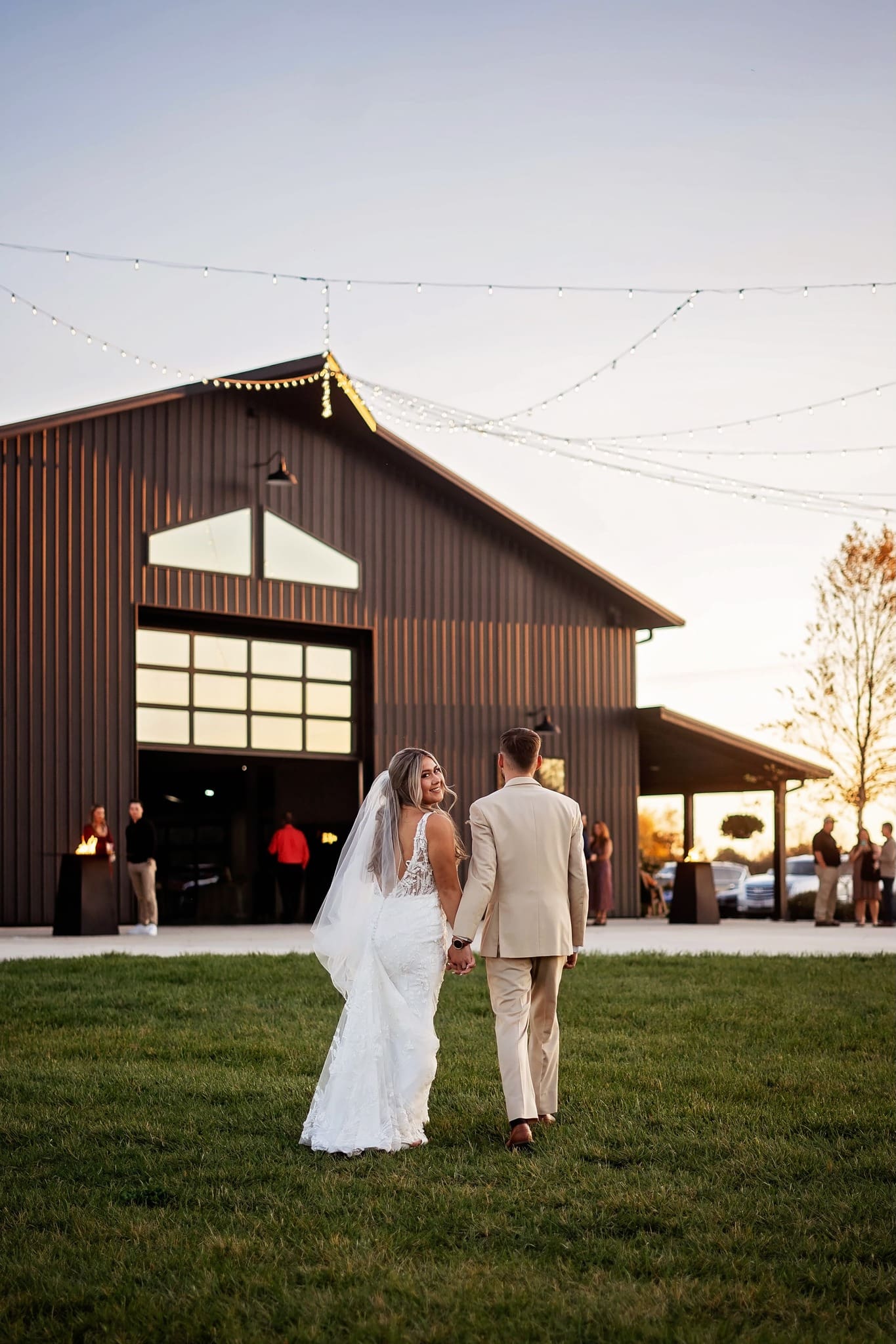 Following the outdoor ceremony, the celebration moved into the venue’s sleek reception barn. While Ashton and Ainsley took a few moments for private vows, guests mingled, explored the photo booth, and enjoyed signature cocktails from the open bar.