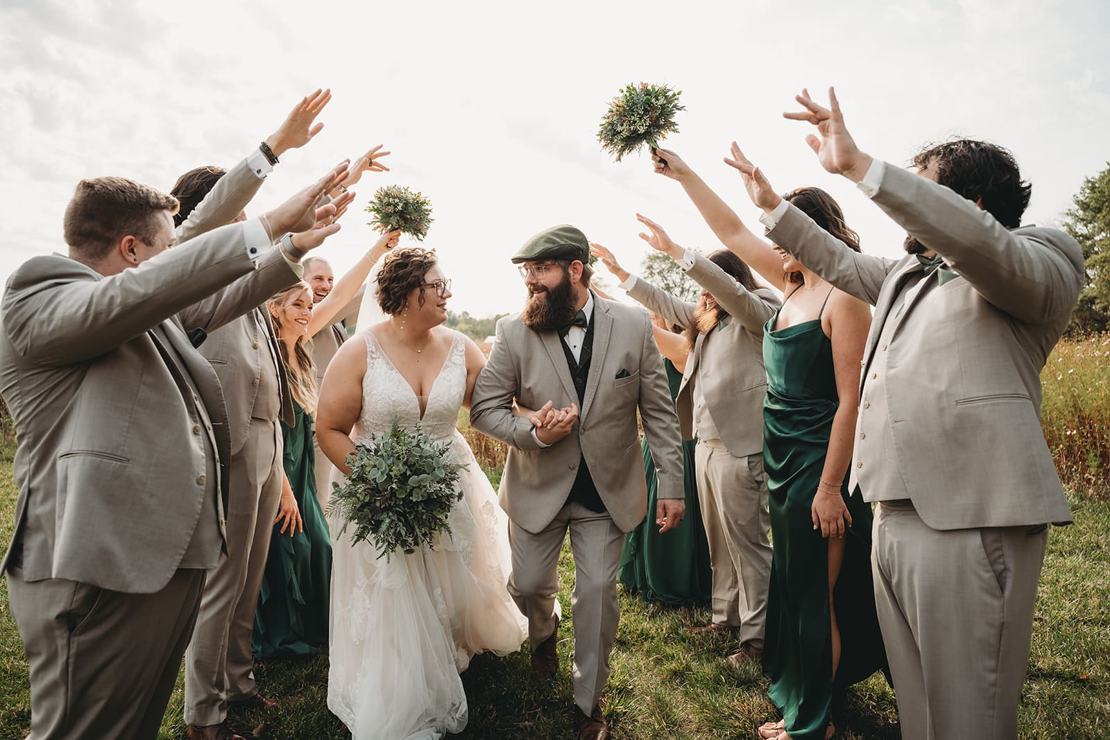 Her bridesmaids were equally stunning in mismatched emerald green dresses, each showcasing their unique style while harmonizing with the day’s color palette. Their bouquets were crafted with textured greenery, echoing the natural beauty of the farm’s surroundings and adding a fresh, organic touch.