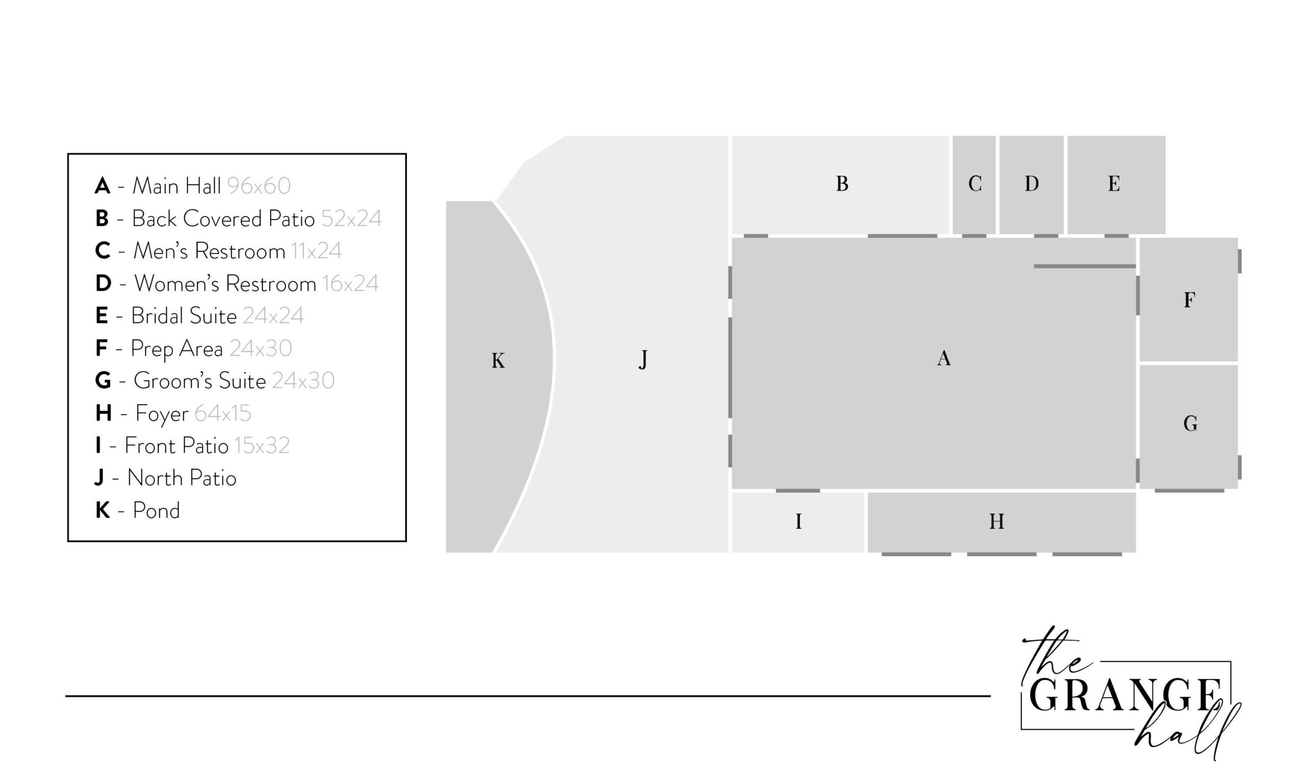 - Our large North Patio featuring a retaining wall that includes a flat/dry concrete base directly attached to The Grange Hall overlooking our 1/2 acre pond and fountain. Most of our couples fall in love with our 16Ă—16 black garage door that is located on the north end of the barn and choose to have it be the backdrop for their perfect ceremony.