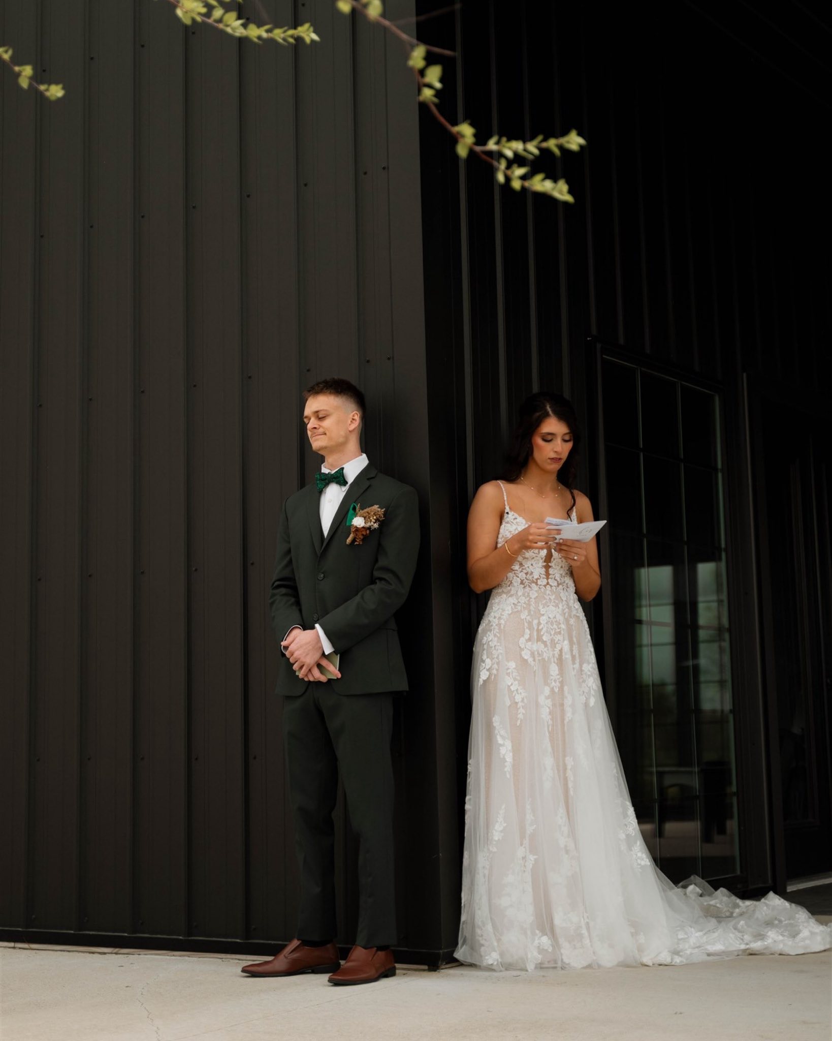 Drew brought contrast and polish in a deep green suit, finished with a subtly floral-patterned green bowtie and matching pocket square. A modern, bold look that beautifully complemented the palette.