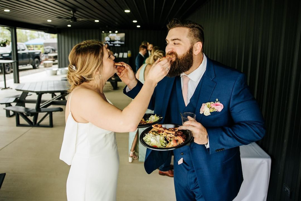 The North Patio provided the perfect setting for McKenna and Devin’s May ceremony, with the field serving as a peaceful natural backdrop. A wooden arbor draped in soft white fabric and adorned with an asymmetrical floral arrangement took center stage, framing the couple as they exchanged heartfelt vows. The blush and white tones of the flowers perfectly complemented the wedding’s elegant color palette, creating a serene and romantic atmosphere.