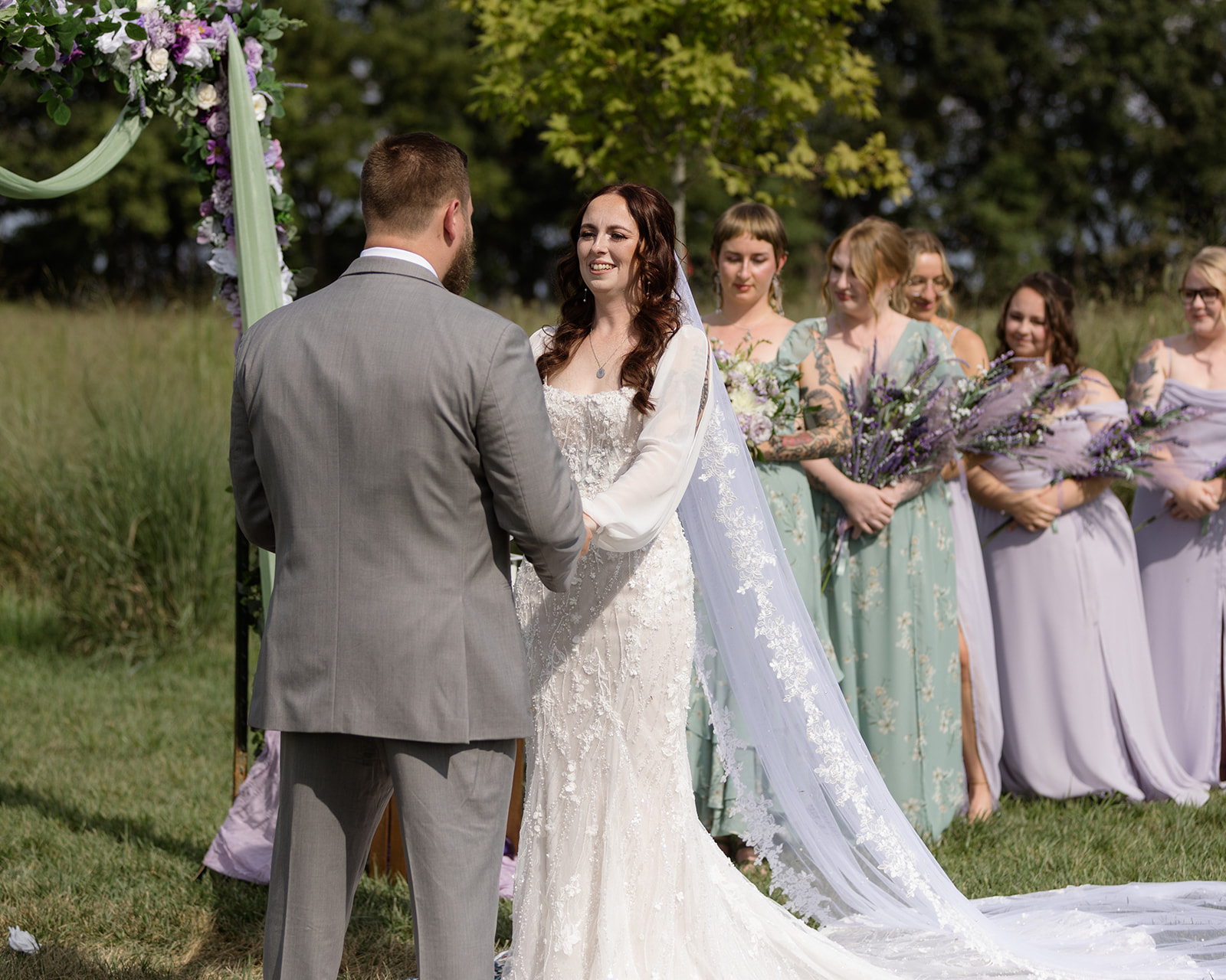 The bridesmaids wore mismatched gowns in soft lavender and sage tones, with a few floral prints sprinkled in for texture. Each carried a smaller bouquet filled with purple pampas, white florals, and touches of greenery. It beautifully complemented the pastel wedding palette. Together, the bridal party reflected the delicate yet joyful spirit of a summer Ohio barn wedding.